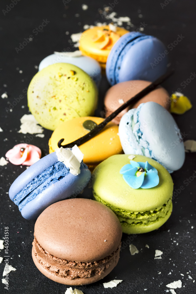 Assorted colorful french cookies macaroons on a black background.