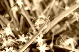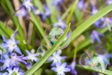 Three delicate and colorful soap bubbles clinging to a blade of grass, purple flowers in the background