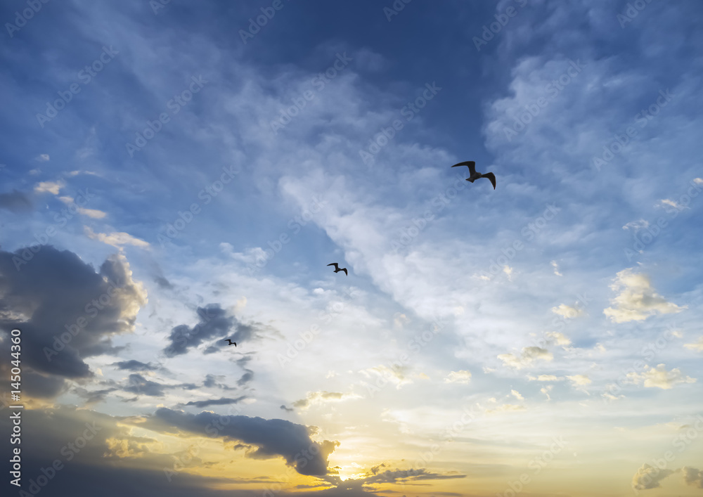 Inspirational sunrise behind three birds soaring loftily through the sky, achievement and success concept