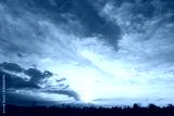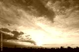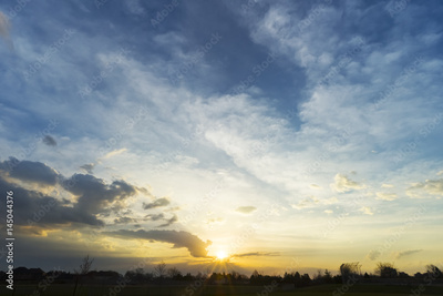 Golden sunrise and blue sky over silhouette of residential community houses and park, large skyscape with space for text