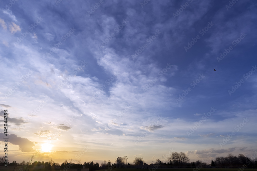 Community park and houses sleeping under a wide sunrise dawn, large skyscape with space for text