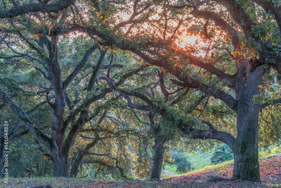 Coast Live Oak Forest (Quercus agrifolia) Sunset. Ed Levin County Park, Santa Clara County, California, USA.