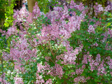 Syringa pubescens patula | Miss Kim lilac shrub producing panicles of purple tubular flower buds with lobed corollas tubes, white-throated on stems with rounded felted green foliage
