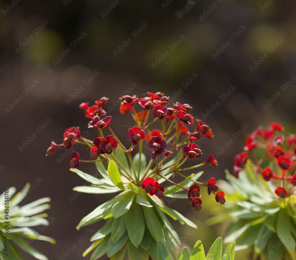 flora of Tenerife - spurge Euphorbia atropurpurea, endemic to the island, natural macro floral background