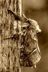 Pine butterfly Panolis flammea with brown wings and light spots. The pine owl butterfly.