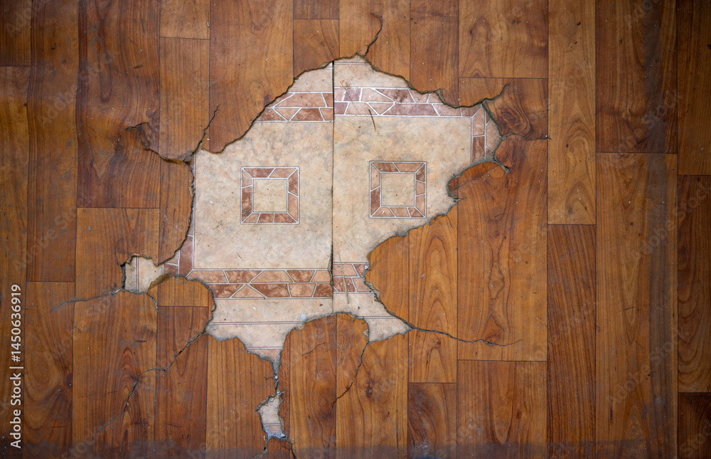 Old linoleum with cracks on the wooden surface. Repair of floor coverings. Linoleum on the floor in the apartment.