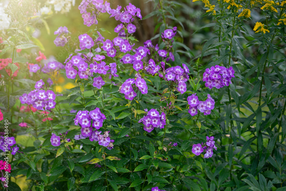 Purple flowers of the paniculate phlox with small petals.A perennial flower in the park and in the flower bed.