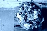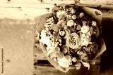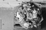 Colorful bouquet of different fresh flowers against brick wall. Bunch of orchids, roses, freesia and eucalyptus leaves. Rustic flower background