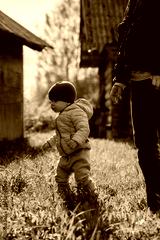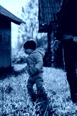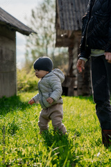 Small little boy in winter jacket roaming and running around country side property in sunny day exploring country lifestyle of family together