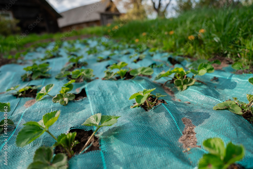 Country side strawberry plants on a farm property, fresh plants planted in garden