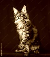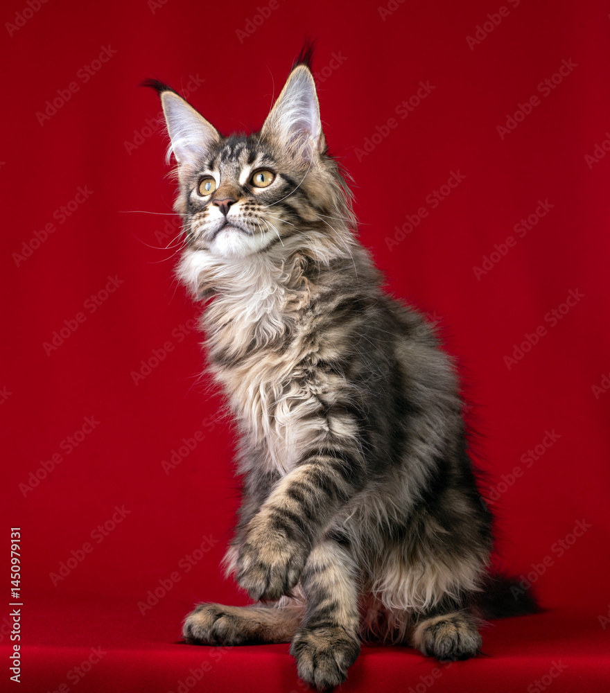 Beautiful Maine Coon kitten on a red background.