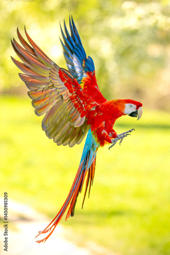 Colorful Scarlet Macaw in Mid-Flight Against a Blurred Green Background