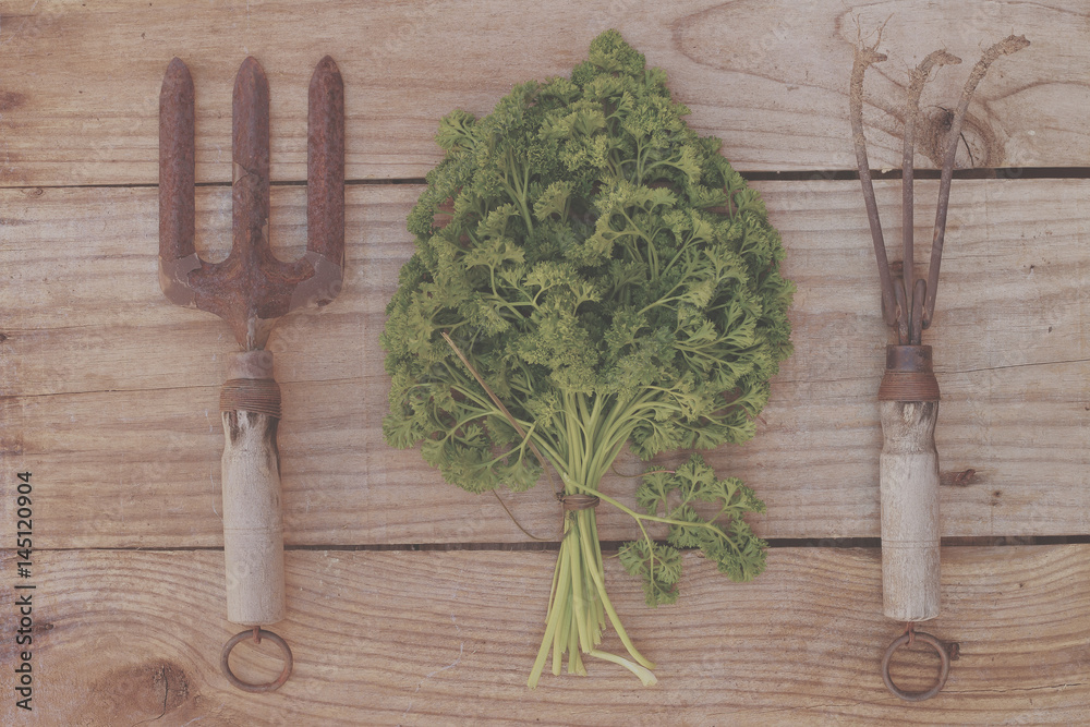 Bouquet of parsley between garden tools on a table of old wooden boards