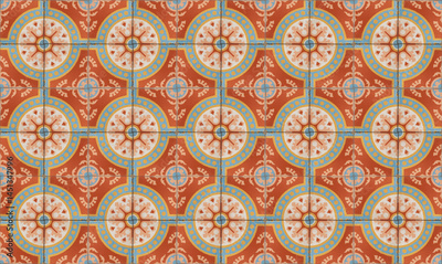 Decorative Mexican floor tile pattern, orange, blue, aqua, yellow, white, cream