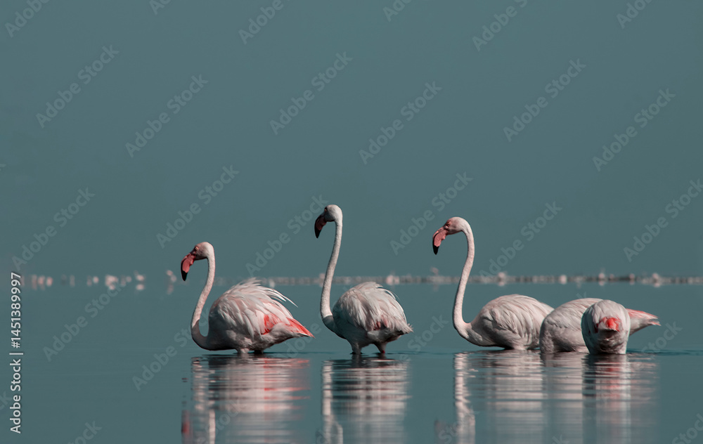 African wild birds. A flock of great flamingos on the blue lagoon against the bright sky