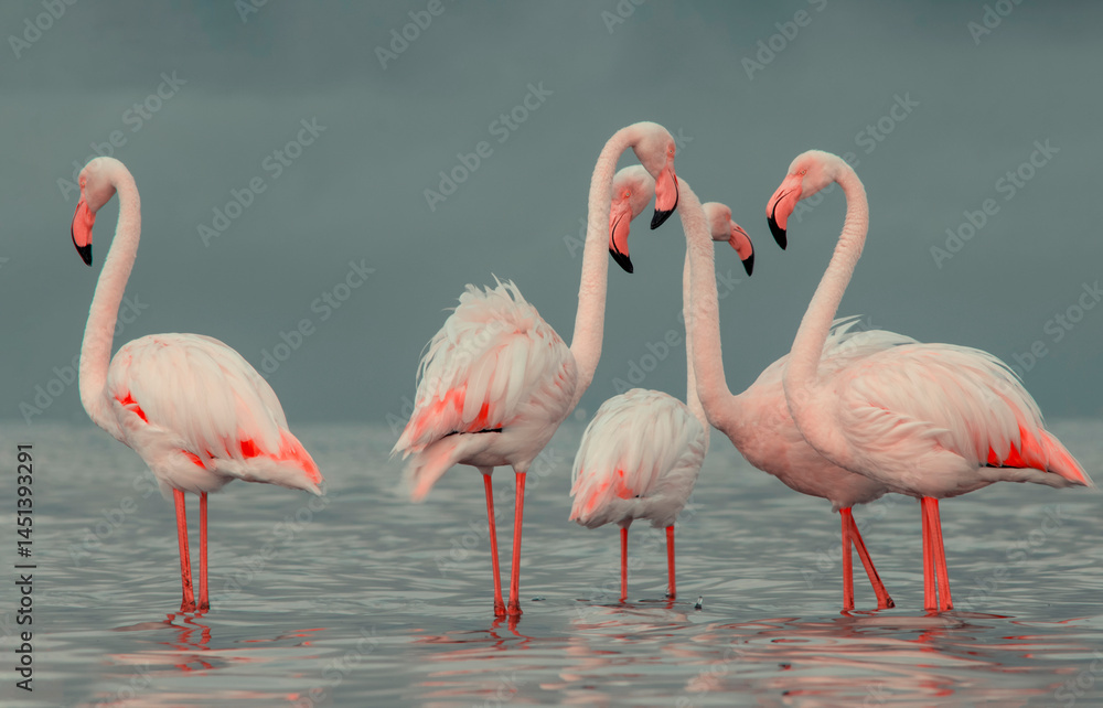 African wild birds. A flock of great flamingos on the blue lagoon against the bright sky