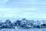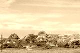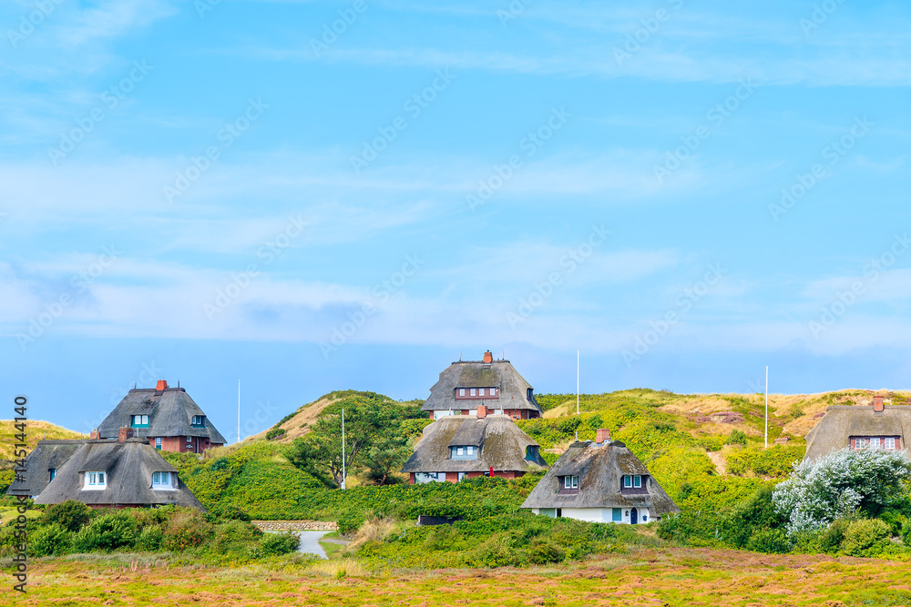Typical Frisian houses with straw roofs on sand dunes in Kampen village, Sylt island, Germany