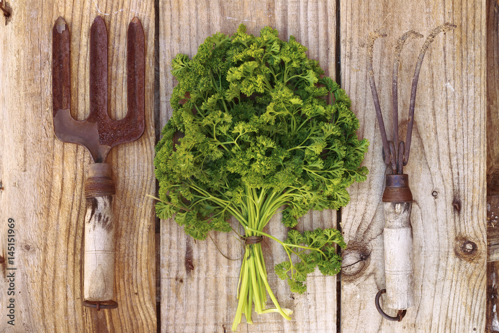 Bouquet of parsley between garden tools on a table of old wooden boards