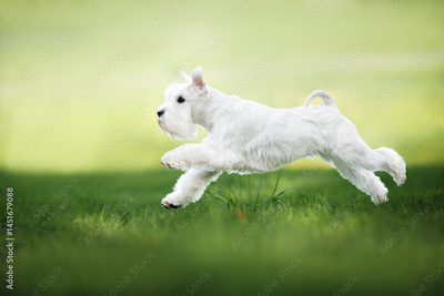 miniature schnauzer dog jumping above grass in summer