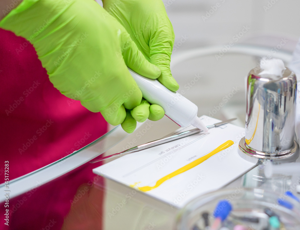 Dentist at work preparing catalyst gel for treatment in dental clinic