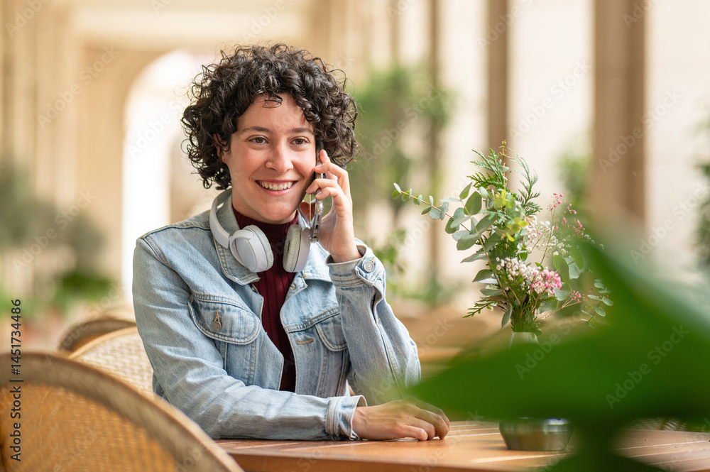 Smiling freelancer talking on phone in a restaurant