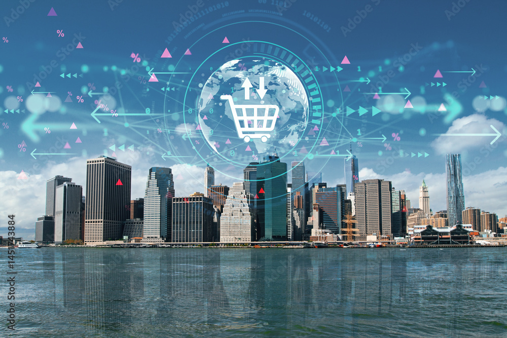 Ecommerce symbol overlay on cityscape with digital technology elements and holographic arrows representing online business and digital economy growth.