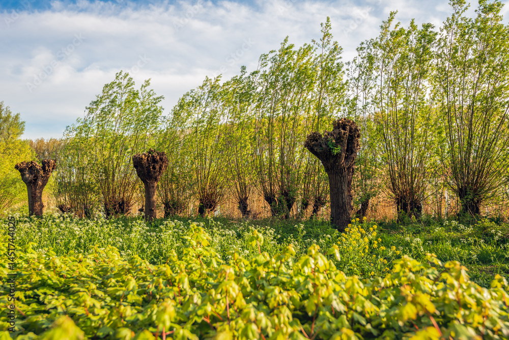 Row of pollard willows at the beginning of the spring season. Some have been pruned and other trees already have fresh green leaves growing on their branches. The blue sky is slightly cloudy.