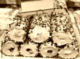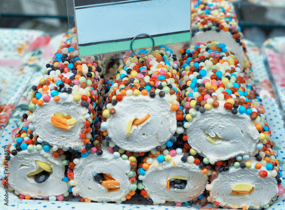 Creamy sweets sprinkled with multi-colored pellets with fruit inside lie on top of each other.