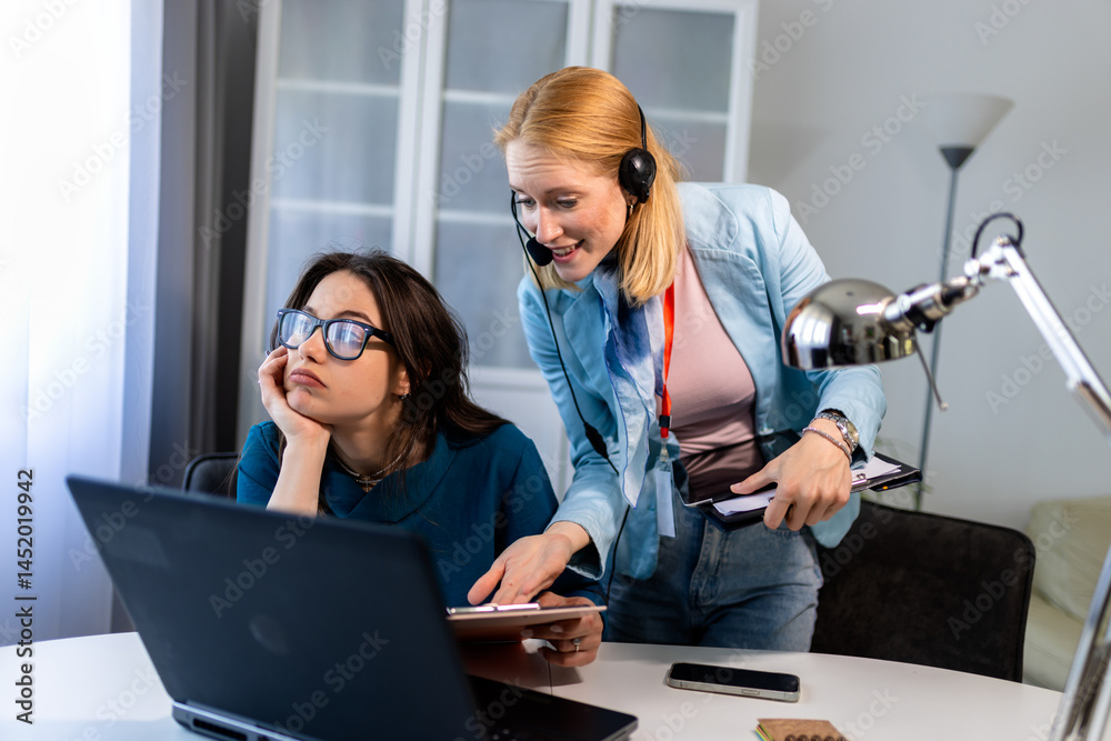 Women in a home office: one wearing a headset for remote work.