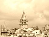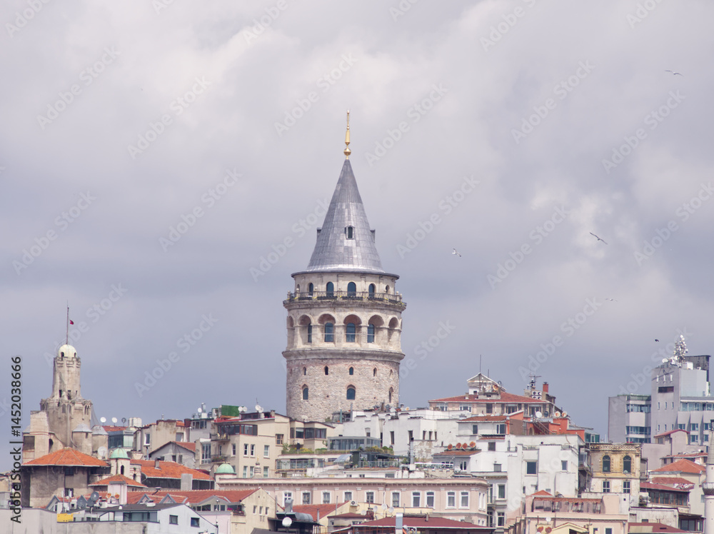 Iconic Galata Tower rises above Istanbul's cityscape with historic buildings and cloudy sky