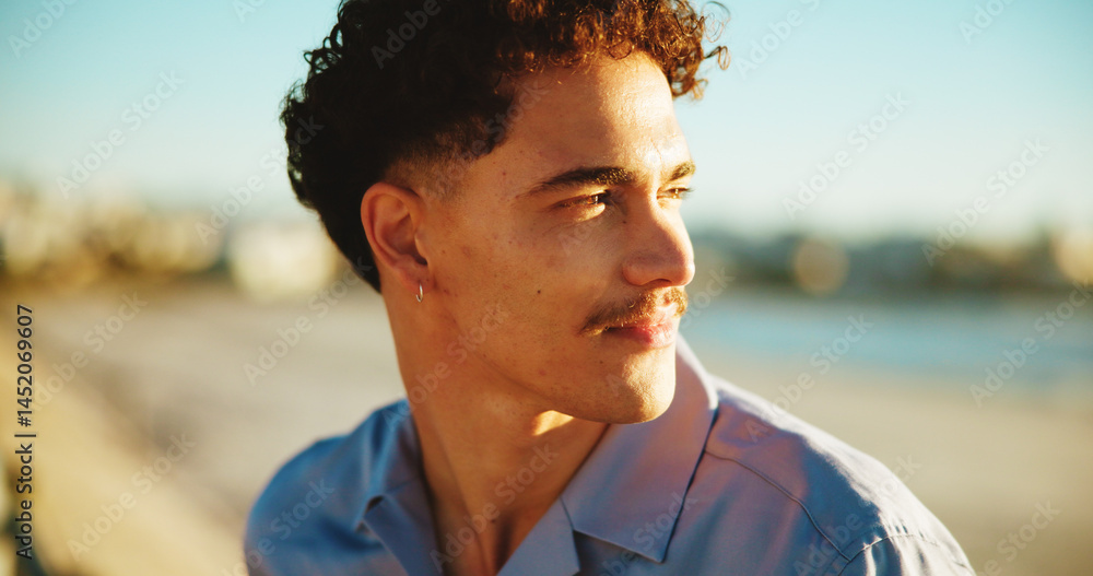 Sunset, thinking and beach with man, vacation and nature with memory, reflection and wonder. Seaside, summer holiday and happy person with weekend break, decision and choice with peace or travelling