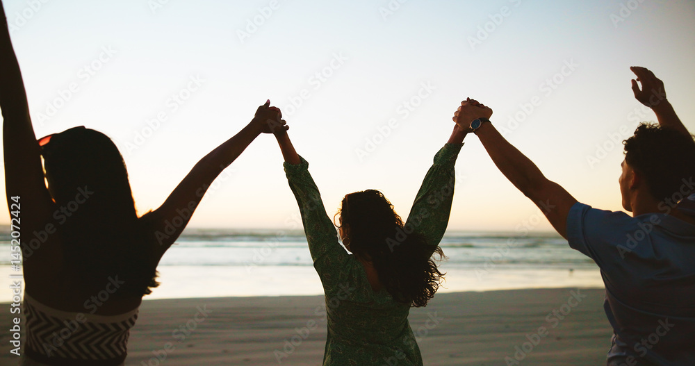 Holding hands, freedom and friends on vacation, beach and summer holiday for group in nature or outdoor. Ocean, bonding or back of people on getaway, water or together for reunion on trip in paradise
