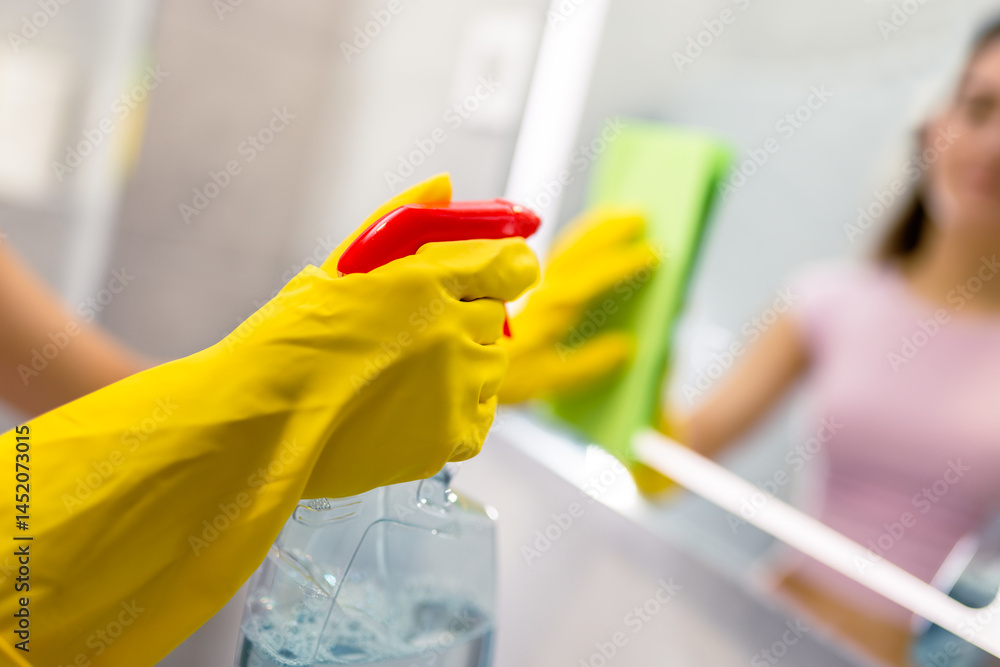 Cleaning the bathroom mirror: woman using a cloth to remove smudges.