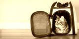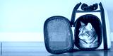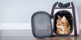 Bengal cat in a carrier in a room.