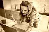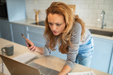 Woman working remotely from kitchen while drinking coffee and reviewing documents on laptop