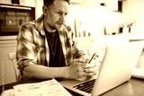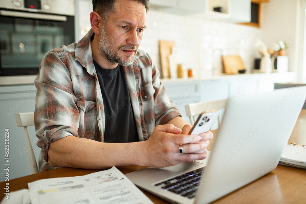 Stressed man looking at bills on laptop at home kitchen table