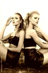 Glamour makeup two women with long hair style sitting on street wall background in dark. Fashion color portrait