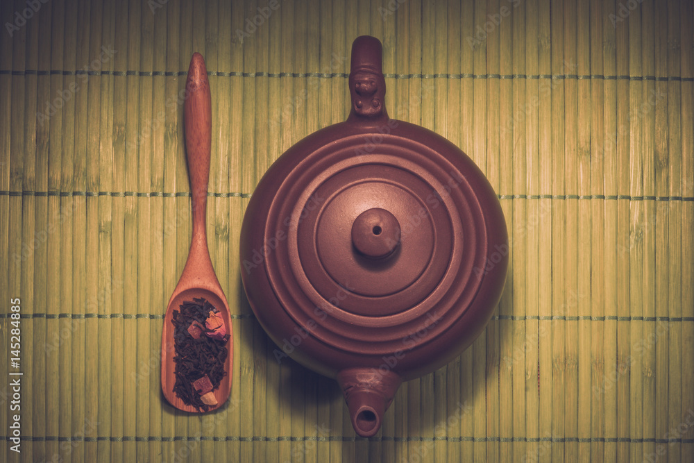 Close-up ceramic teapot, aromatic dry tea with fruits and petals in wooden spoon on green bamboo background. Retro filter.
