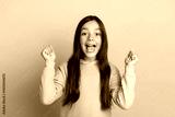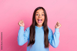 Excited preteen girl in blue sweatshirt making happy gestures against a vibrant pink background