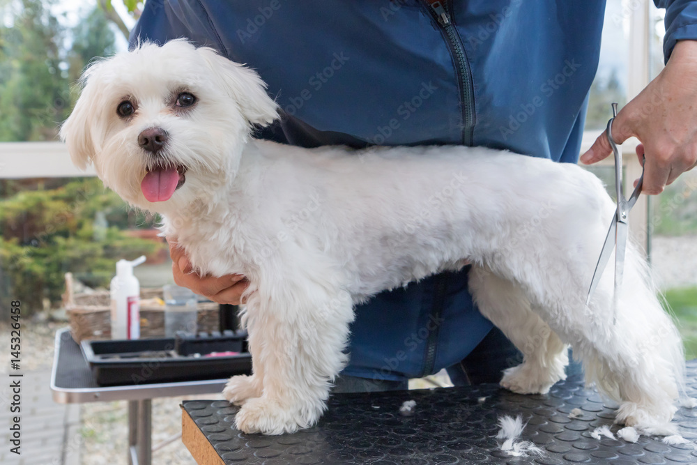 Cutting the rear leg of adorable white dog. The dog is standing on the grooming table and looking at the camera. All potential trademarks are removed.