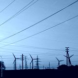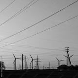 Wind power plants and power transmission lines against the sunset sky