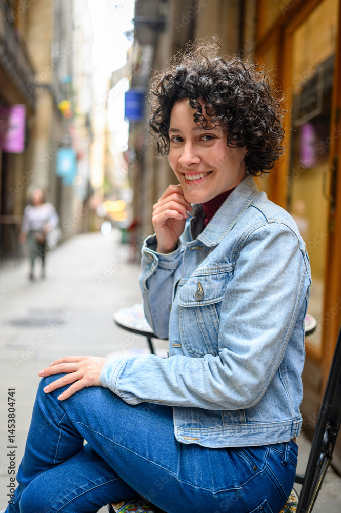 Smiling tourist sitting at outdoor cafe in Barcelona's gothic quarter