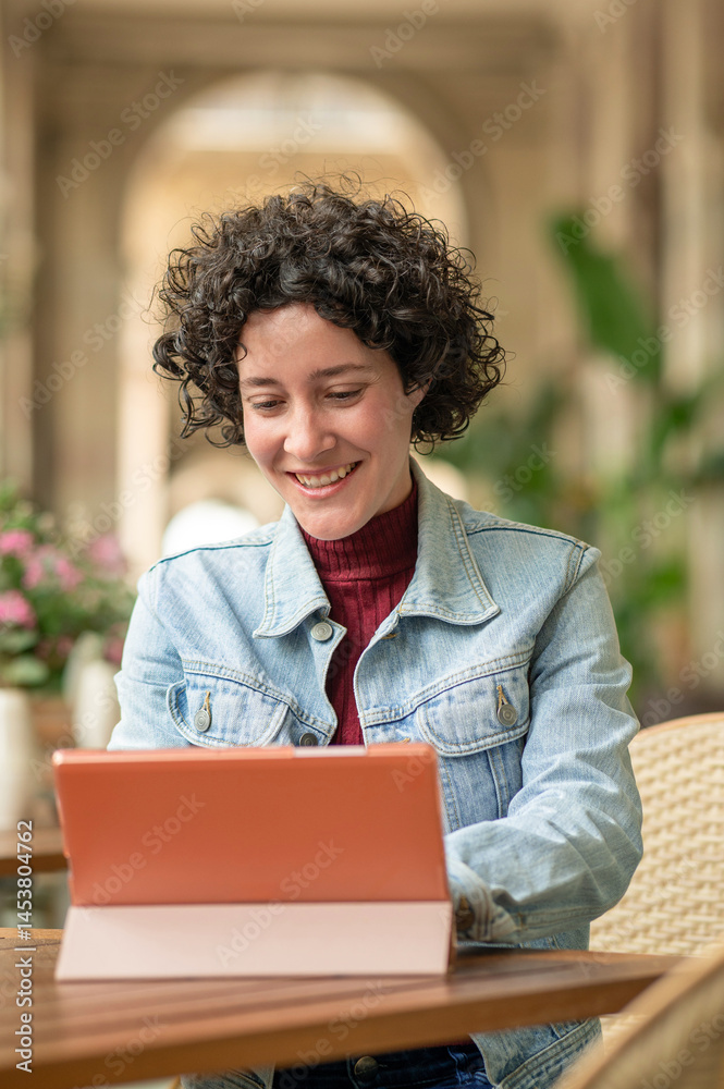 Freelancer working remotely on tablet in a cafe, enjoying digital nomad lifestyle