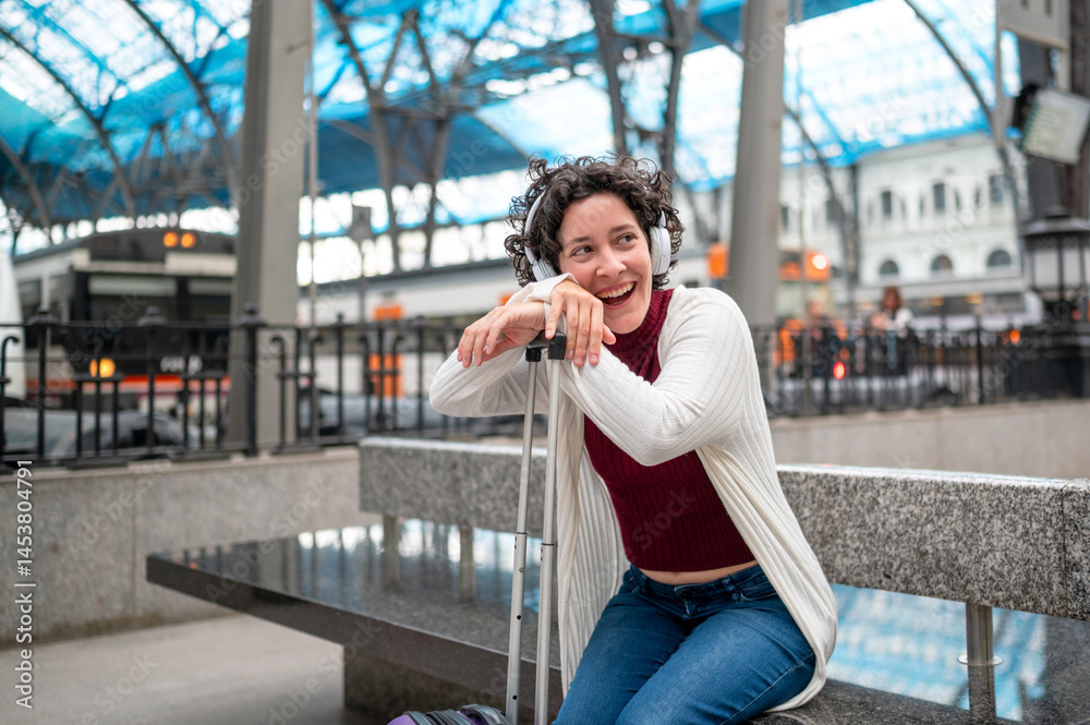 Tourist woman listening music with headphones and waiting train in station