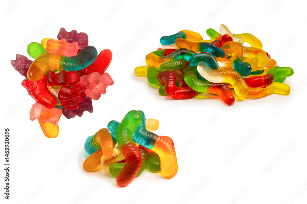 Assorted colorful gummy candies isolated on a white background. Top view. Jelly sweets.