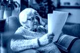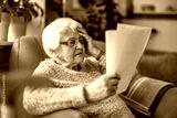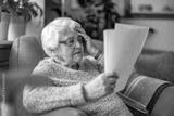 Elderly woman wearing eyeglasses reading documents while sitting in an armchair in living room