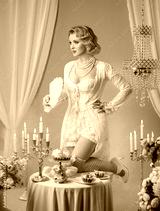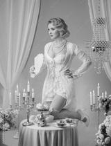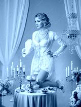 sexy blonde woman queen beauty face, posing at dinner table hand holding fan waving hot summer air. Girl princess self-confident, Victorian style blue wall room pink flowers in vases, vintage dress