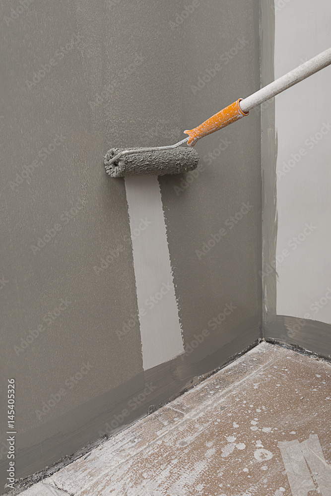 Vertical image of a painting roller painting wall in gray.