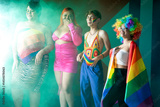 Group of young lgbtq friends smiling having fun at studio and holding lgbt flags. People lifestyle, fashion, pride month.