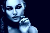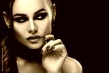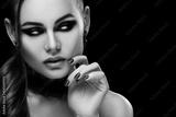 Close up studio beauty portrait of young pretty playful woman with flawless skin, big lips, smokey eye make up, posing on black background. Model touching her face, looking aside. Copy, empty space